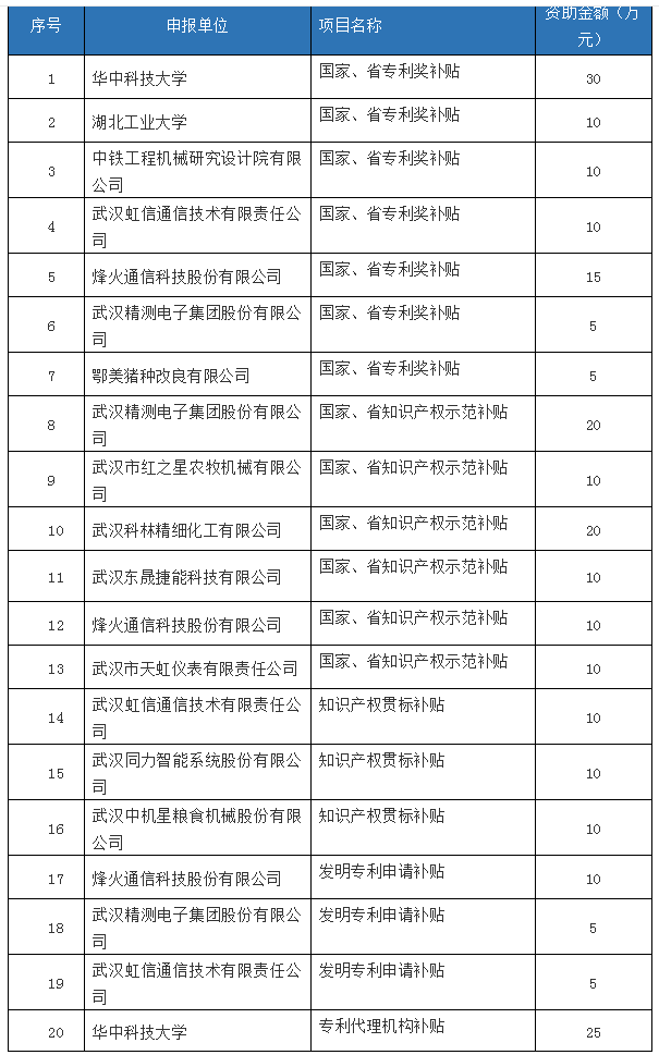 本次資金撥付對象為獲得洪山區(qū)2018年度洪山區(qū)知識產(chǎn)權(quán)項目資金的企業(yè),名單及資助金額見附件。