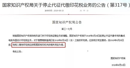 自2019年8月25日起,國(guó)知局停止代征代繳印花稅業(yè)務(wù),納稅人繳納印花稅應(yīng)按照國(guó)家稅務(wù)機(jī)關(guān)的相關(guān)規(guī)定辦理。