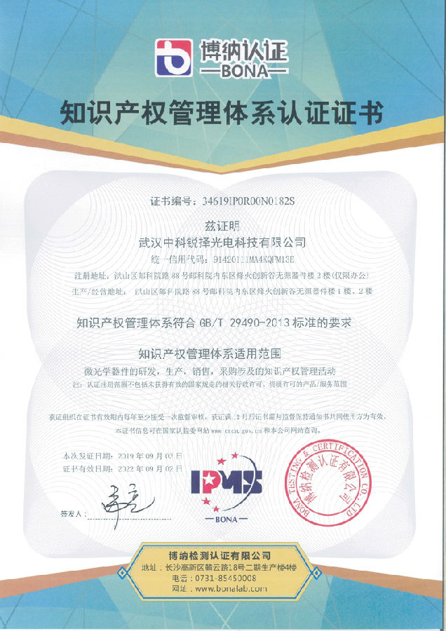 熱烈祝賀武漢中科銳擇光電科技有限公司于2019年9月獲得知識產(chǎn)權(quán)貫標(biāo)認證證書,這意味著中科銳澤在知識產(chǎn)權(quán)領(lǐng)域獲得到重要認可,在知識產(chǎn)權(quán)方面得到進一步規(guī)范和在綜合競爭力得到進一步提升。